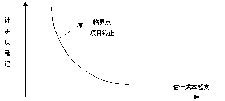 一種對風險評估的常用技術是定義風險的參照水準,對絕大多數ERP軟件項目來講,風險因素——成本、性能、支持和進度就是典型的風險參照系。也就是說對成本超支、性能下降、支持困難、進度延遲都有一個導致項目終止的水平值。如果風險的組合所產生的問題超出了一個或多個參照水平值時,就終止該項目的工作,在項目分析中,風險水平參考值是由一系列的點構成的,每一個單獨的點常稱為參照點或臨界點。如果某風險落在臨界點上,可以利用性能分析、成本分析、質量分析等來判斷該項目是否繼續工作。圖2 表示了這種情況。