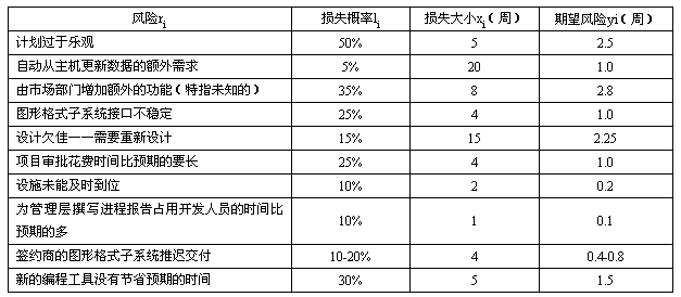 表1是風險分析表的一個例子,可以建立一個用風險、損失概率、損失大小和期望風險這樣的風險評估表。