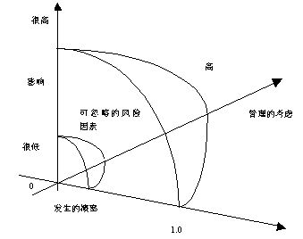 一旦完成了風險表的內容,就可以根據概率及影響來進行綜合考慮,風險影響和出現概率從風險管理的角度來看,它們各自起著不同的作用(見圖1)。一個具有高影響但低概率的風險因素不應當占用太多的風險管理時間 ,而具有中到高概率、高影響的風險和具有高概率及低影響的風險,就應該進行風險分析。