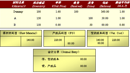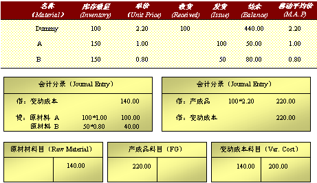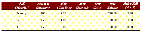 ● Dummy 材料的移動平均價沒有變化,庫存數量增加100個,金額增加了為 100*2.20=220.00。