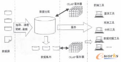 著名的數據倉庫專家W.H.Inmon在其著作《Building the Data Warehouse》一書中給予如下描述:數據倉庫(Data Warehouse)是一個面向主題的(Subject Oriented)、集成的(Integrate)、相對穩定的(Non-Volatie)、反映歷史變化(Time Variant)的數據集合,用于支持管理決策。整個數據倉庫系統是一個包含數據源,數據的存儲與管理,OLAP服務器,前端工具四個層次的體系結構,具體如圖1所示。