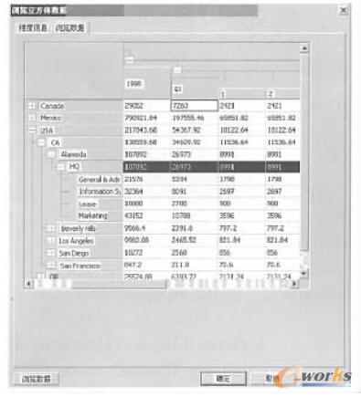 數據倉庫是按主題組織數據的,每個主題可以看作是一個數據立方體,一般每個數據立方體都有好幾個維,每個維內又有一些層次。復雜的數據立方體在展現上缺乏直觀性,尤其當維度超出三維后,數據的表示就比較困難,因此這里采用一種二維表格的形式來表示整個數據立方體,并在此之上進行多維分析操作。數據立方體中的維都被劃分到行維或列維兩種維度中去,在二維表的固定行和固定列中用樹型結構體現維的層次結構和層次關系,在行維和列維交織成的二維表中顯示相應的度量數據,實現以二維表格反映多維特征,提供數據立方體的可視化表示。