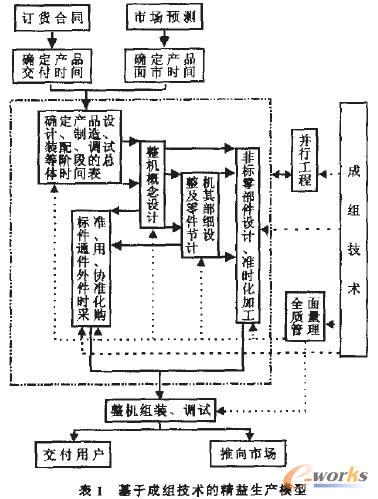 基于成組技術的精益生產模型如圖。從圖1可見:成組技術非常有助于精益生產方式3個特征的實現:(工)準時化原則:在發現產品開發機會后,首先要確定產品交付或面市時間,然后根據這一終端時間以后拉的方式確定產品設計、制造、裝配、調試各階段的總體時間表,整機組裝、調試前有關零部件的加工和采購均應采用準時化原則組織生產,避免因零部件提前制作、購置而造成資金和庫存方面的浪費,采用成組技術后,可大大縮短產品、零部件設計時間,制定零部件加工、裝配、檢測工藝的時間及機床、夾具、刀具、量具等的準備時間,更精確地實現準時制生產.(2)并行作業原則產品從概念設計開始應盡量多的采用并行工程.在概念設計時應考慮產品生命周朗的全過程,包括質量、成本、進度、用戶要求和產品報廢回收產品開發各階段是重疊的.在對非標零部件進行結構設計的同時,進行加工的工藝編排和機床,刀具、工裝量具、材料等方面的準備工作對于外協件應及時進行外協加工,這祥才能縮短產品開發、牛產時間采用成組技術后.非標零部件結構設計加工、裝配工藝設計,刀、量、夾具設計均按照零部件的編碼從產品數據庫中選取相近或相同的設計進行借鑒、更改.這將極大地壓縮零部件設計和加工的周期,充分實現并行工程.并巨這也有利于產品開發過程中信息交流及時,發現問題及早解決,提高產品開發的質量(3)全面質量管理原則:產品細節設計,非標零部件結構設計、工藝過程制定、生產準備、加工,標準件、通用件、外協件采購整機組裝、調試均采用全面質量管理.每個部分,每個人都應以高度的責任心保證自己完成的任務是合格的在追求零廢品率的同時減少儉查、測雖費用_采用成組技術后,利用相似性原理,產品及其零部件的設計,加工裝配等的檢驗方法,檢驗程序非常容易確定,其質量更容易得到控制,這些方面的工作量也大大減少,非常有利于實現全面質量管理。