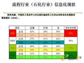這個(gè)數(shù)據(jù)是來源于我們的行業(yè)協(xié)會(huì)提供的一個(gè)數(shù)據(jù)。相對來說,流程行業(yè)一般企業(yè)規(guī)模都比較大,信息化的基礎(chǔ)相對比較好,走在其他行業(yè)的前列,通過表格可以看到,流程行業(yè)已經(jīng)應(yīng)用了哪些系統(tǒng)。在當(dāng)今無論是ERP還是大家剛才介紹的生產(chǎn)管理控制系統(tǒng),這些在流程行業(yè)都有深入的應(yīng)用。從圖上還能看到截止到2009年底流程行業(yè)的總的態(tài)勢和水平,已不僅僅滿足于簡單的財(cái)務(wù)這樣一個(gè)應(yīng)用。