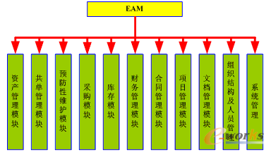 EAM系統主要包含的模塊有:資產管理模塊、工單管理模塊、預防性維護模塊、采購模塊、庫存模塊、工具管理模塊、財務管理模塊、合同管理模塊、項目管理模塊、文檔管理、組織機構及人員管理 、系統管理等。