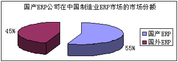 從國內、外ERP軟件公司的市場占有率來看,國外軟件在高端市場上占據了優勢,而國產軟件則在廣大的中小企業上有絕對優勢,用友、金蝶等廠商在該市場的收入遠遠超過國外廠商。2004年,我國ERP軟件廠商的營業額占整個中國制造業ERP市場的55.18%。