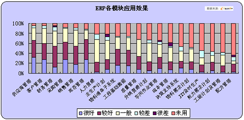 從制造業ERP的整體效果來看,財務與物流模塊的應用效果相對較好,至少不少企業通過實施該系統初步理順了物流和資金的情況,初步做到了實物帳與財務帳的統一,此外供應商管理、客戶關系管理等模塊的應用效果較好,生產管理與成本管理則應用效果一般,而人力資源、分銷管理等模塊由于軟件所提供的功能相對簡單,沒法滿足企業深層次的應用,應用深度不夠,企業的整體滿意度也不高。