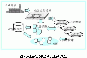 基于企業(yè)建模的信息系統(tǒng)戰(zhàn)略規(guī)劃就是在模型上完成從需求層的業(yè)務(wù)核心模型到設(shè)計(jì)層的信息系統(tǒng)模型的抽取過程,如圖2所示。根據(jù)建立并優(yōu)化分析好的業(yè)務(wù)核心模型,從過程模型中根據(jù)功能抽離組織出信息系統(tǒng)需要實(shí)現(xiàn)的業(yè)務(wù)功能和功能結(jié)構(gòu),并且將過程中涉及到的活動(dòng)、活動(dòng)之間的邏輯關(guān)系和活動(dòng)之間的數(shù)據(jù)流映射成這些功能單元里面的功能操作、功能單元之間的交互關(guān)系以及整個(gè)信息系統(tǒng)中的數(shù)據(jù)流,這些功能單元將配置成最后運(yùn)行的信息系統(tǒng)中的子系統(tǒng)或者系統(tǒng)組件。將過程模型中活動(dòng)使用的和傳遞的各種可以用表單形式表達(dá)的數(shù)據(jù)抽取整理成為信息模型,描述數(shù)據(jù)結(jié)構(gòu)和數(shù)據(jù)關(guān)系,同時(shí)功能單元之間交互的數(shù)據(jù)來源于這個(gè)信息模型。最后,再根據(jù)業(yè)務(wù)核心模型中描述的業(yè)務(wù)過程所關(guān)聯(lián)的產(chǎn)品信息、組織信息和資源信息,可以確定未來數(shù)據(jù)庫的系統(tǒng)結(jié)構(gòu)、網(wǎng)絡(luò)結(jié)構(gòu),構(gòu)造信息系統(tǒng)各功能單元之間的集成框架。