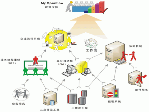 可通過內嵌工作流引擎在OpenFlow系統中再現符合企業的最優業務流程,并輔助郵件、消息服務器建立協同工作機制,把業務流程的每一步驟完整地“串”在了一起,實現分工協同工作。