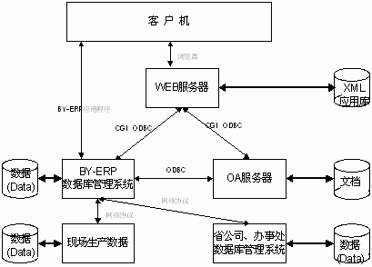 在分布式數據庫支撐下,利用集成平臺(商品化的原型系統,面向對象的開發工具,Web技術,JAVA開發語言),OA群件(LOTS/Domino),API(應用程序接口)等建立ERP系統和OA系統。
