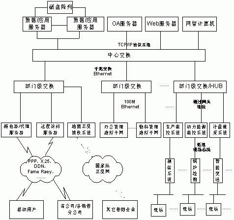 網絡由廠級主干網、部門級局域網絡及工業現場總線三層次構成,F場總線網絡主要分布在各車間,用于連接生產、分析等自動采集設備;部門級網絡應用在各車間、各業務部門及綜合辦公樓;廠級網絡連接各部門級網絡和服務器,構成網絡系統的主干。