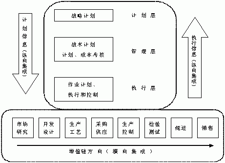 縱向企業集成是面向制造領域的集成,是指在不同的控制和管理層的系統之間的集成,打破企業底層制造執行系統和上層的制造管理系統上下之間的交流障礙。其目標是共同分享企業內信息,對業務過程中的一些問題迅速作出決策。