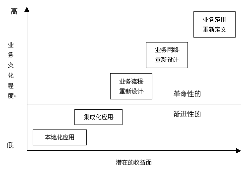 從模式1到模式2是一個自然發(fā)展的漸進過程,一般發(fā)生在開始應(yīng)用IT的一段時間之后。遺憾的是,這一階段的收益也無疑是一個緩慢過程,企業(yè)一般沒有充分發(fā)揮IT手段的潛能。應(yīng)用模式3、4、5則發(fā)生了革命性的變化,這些應(yīng)用模式不是從現(xiàn)有的工作方式開始應(yīng)用IT,而是注重對人們已習(xí)慣的原有工作方式與工作流程進行重新改造與設(shè)計,然后發(fā)揮IT手段支持新的工作方式的能力。改造過程愈深,改造范圍愈廣,收益也就愈大