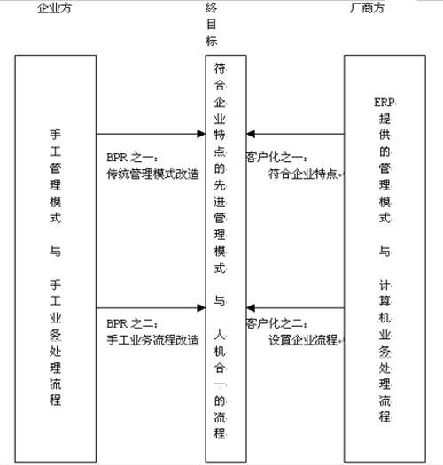 第二,企業(yè)手工業(yè)務(wù)處理流程必然存在很多重復(fù)或無效的業(yè)務(wù)處理環(huán)節(jié),很多業(yè)務(wù)處理方式也不符合計算機信息處理的要求,為此需要對手工業(yè)務(wù)處理流程進行重組,這是ERP實施過程對企業(yè)進行BPR的內(nèi)容之二。另一方面,在重新設(shè)計出企業(yè)新的業(yè)務(wù)處理流程后,需要對軟件功能按新的業(yè)務(wù)處理流程進行客戶化菜單設(shè)置或調(diào)整,這是ERP實施過程中客戶化工作的內(nèi)容之二。從兩個方面的改造或調(diào)整,最后達到在計算機業(yè)務(wù)處理方式下的“人機合一”的和諧境界。