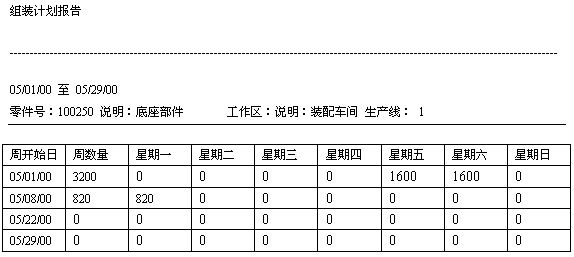 生產計劃報表包含的信息有:零件號、零件描述、所加工的車間代號及描述、主碼代號包含了該零件的工作中心及WIP貨位、周開始日、周數量及在一周內每日的生產計劃量。如表2組裝計劃報告