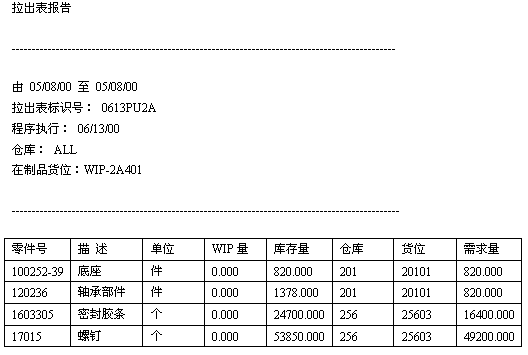拉出表可視為“看板”中的移動卡,它是用來控制物料移動的,它在后序工作中心的在制品貨位和前序工作中心的貨位之間進行移動。拉出表上包括的信息有:零件號、單位、WIP量、庫存量、倉庫、貨位、需求量、前工序工作中心代碼,后工序工作中心代碼。如表1拉出表報告