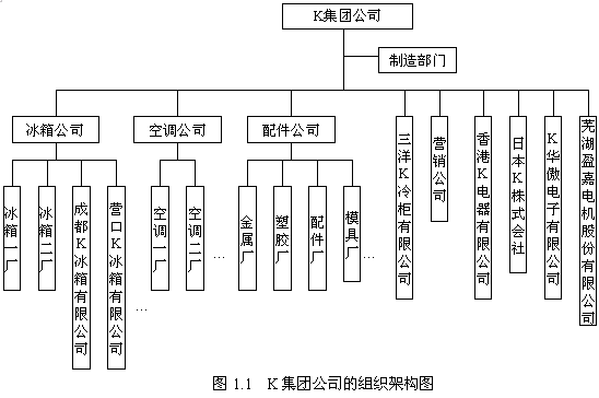 K集團公司下屬有冰箱公司及下屬冰箱一廠、冰箱二廠、成都、營口K公司冰箱有限公司等等;空調公司下屬空調一廠、空調二廠、南昌K公司、鄭州K公司等等;配件公司及下屬金屬廠、塑膠廠、配件廠、模具廠等分廠;三洋K公司、營銷公司、香港K公司電器等等都直屬集團公司管轄。如圖1.1,