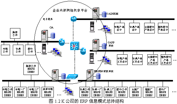 在“整體設計,分步實施”宗旨的指引下,K公司的ERP系統總體結構囊括了產品設計(CAD/PDM)、工藝設計(CAPP)、制造資源計劃(MRPII)、辦公自動化(OA)、電子商務等。K公司通過采用ERP系統較好地實現了多地域、多工廠、多子母公司,“分布運行、集中控制”的經營管理方式。