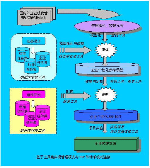 企業(yè)建模技術和任務庫管理技術使得對管理模式、管理方法的結(jié)構(gòu)化描述和可視化管理成為現(xiàn)實,方便了管理思想管理模式的有效積累,從而成為新一代ERP縱向集成的前站。