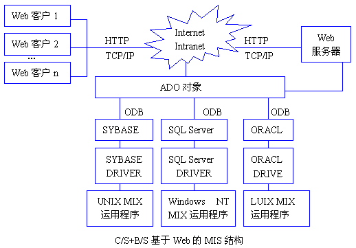 通過比較發(fā)現(xiàn),B/S具有許多C/S說沒有的優(yōu)點(diǎn),但是由于目前的B/S開發(fā)工具還不夠成熟,所以B/S得成本相對(duì)要高。對(duì)于企業(yè)的B/S應(yīng)用,從當(dāng)前技術(shù)水平看,特別適用于系統(tǒng)統(tǒng)用戶交互量不大的應(yīng)用,對(duì)于要求高速、頻繁交互的模式則采用C/S體系,所以兩者的應(yīng)用時(shí)相互補(bǔ)充的。這種混合模式是企業(yè)應(yīng)用最大的模式,其基于Web的管理信息體系流程圖如下: