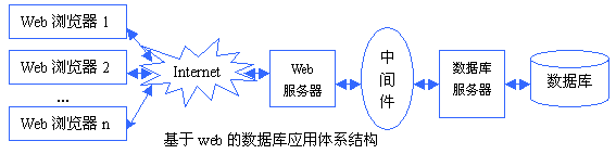 Web系統(tǒng)的基礎(chǔ)模式是三層體系結(jié)構(gòu)的B/S。第一層是用瀏覽器完成用戶的接口功能;第二層由各種服務(wù)器完成用戶所需的服務(wù)功能;第三層有由數(shù)據(jù)服務(wù)器完成數(shù)據(jù)存儲(chǔ)和管理功能。基于web訪問數(shù)據(jù)庫(kù)的應(yīng)用通常包含以下4部分的內(nèi)容:web服務(wù)器、web瀏覽器、數(shù)據(jù)庫(kù)服務(wù)器、中間件(如路由器,集線器等),其體系結(jié)構(gòu)如下圖: