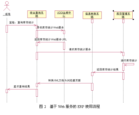 按照上述部署步驟,綜合查詢系統、企業信息門戶與ERP系統的集成通過Web服務連接起來。例如,領導要通過綜合查詢系統查詢ERP系統中的庫存統計信息,這個查詢過程通過Web服務實現流程如下: