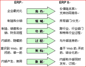 ERPII是指通過支持、整合和優化針對具體行業的公司內部和公司之間的合作、運作和財務過程來創造客戶和股東價值的一種商務發展戰略和一套軟件應用系統。ERPII涉及到業務、應用和技術戰略方面的6項要素:1)角色;2)領域;3)功能;4)過程;5)構架;6)數據。從圖二可以看出ERPII在這六大方面都有別于傳統ERP。