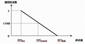 通用性系數COMI(CommonalityIndex)是用以衡量產品物料通用程度的具體指標,0≤COMI≤1。一般情況下,庫存用表示,庫存隨物料通用性程度的高低變化而呈現反向變化,即物料通用性程度越高,則庫存越低;反之,則庫存越高。在極端情況下,即當COMI=0時,是通用性最佳程度,此時庫存最低,用INVlow表示;當COMI=0時,是通用性最差程度,此時庫存最高,用INVhigh表示。圖1表示出COMI與INVnormal之間的關系。