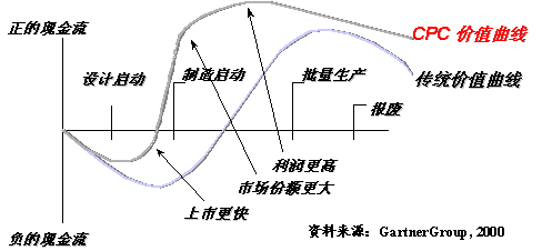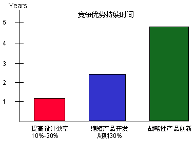 不容置疑的CPC潛力如果說幫助企業實現一種跨企業、跨平臺的協同設計與開發的工作模式,是實施CPC的具體內容,那么“提高產品設計效率”是CPC最為明顯的功能表現。美國著名IT分析公司Gartner Group的數據表明,企業運用CAD/CAM/CAE等專業工具提高產品設計效率在10%~20%之間,因此取得的競爭優勢只能持續1年多;企業運用VPDM/PDM(產品數據管理)等系統可以縮短產品開發周期30%,企業因此取得的競爭優勢只能持續2年半;而企業實施CPC系統管理帶來的將是戰略性的產品創新,因此取得的競爭優勢能持續近5年。