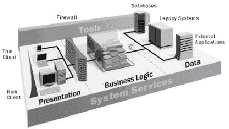 業界當前比較成熟的解決方案是三層結構設計,例如基于微軟體系架構的金蝶K/3ERP系統就是使用典型的WindowsDNA三層體系結構。它具有數據訪問安全性、增強的事物對象管理、高可用性、強大的可擴展性等突出特點。