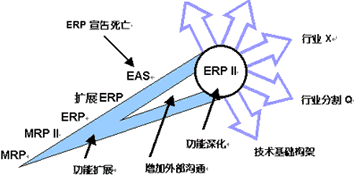 在1990年,Gartner定義了ERP,為資源計劃領域構建了一個新的視野。這個視野是以資源計劃和庫存的精確性為中心,強調車間內部和貫穿整個制造企業的信息共享,不管企業屬于是流程制造、離散制造或者是兩者的組合。因此ERP表現出不同的“風味”。拓展的ERP反映一個現實就是許多的非制造行業求助于ERP系統以獲得財務事務處理能力。當公司尋求可以提供SCM、CRM和電子商務功能的應用軟件以使他們可以超越競爭對手時,ERP供應商的反應是通過合作伙伴、收購、或原產品的開發提供企業應用套裝(EAS)版本。然而,EAS未明白說出的“為企業內所有的人提供所要的一切”的潛臺詞導致了它對關注需求和外部溝通的未來的不適應性。ERP II專注于深層次的各行業領域的專門技術、企業間而不是企業內的業務過程,因而可以很好的適應未來需求。