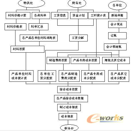至于成本核算系統主要包括資金計劃管理,費用審核報銷和材料成本核算三個子系統。其中費用審核報銷子系統包括費用報銷,應收、應付核算,工資核算。資金計劃管理子系統包括資金計劃管理,產品銷售核算,稽核。材料成本核算子系統包括材料審核報銷,制造費用核算,產品成本核算。成本核算管理工作的業務流程如圖三。