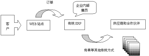 目前,越來越多的企業(yè)意識(shí)到電子商務(wù)是企業(yè)發(fā)展的必經(jīng)階段。于是,企業(yè)紛紛搭建網(wǎng)絡(luò),開通網(wǎng)站,發(fā)布信息,開展網(wǎng)上直銷。在做了這些之后,許多企業(yè)發(fā)現(xiàn)事與愿違,最終的結(jié)果與期望值相距甚遠(yuǎn),個(gè)中原因雖然很多,但一個(gè)重要的因素就是企業(yè)還沒有深刻理解電子商務(wù)的全部內(nèi)涵和真實(shí)本質(zhì),忽視了企業(yè)內(nèi)部流程與外部交易的整合。而電子商務(wù)的本質(zhì)是企業(yè)利用電子方式在客戶、供應(yīng)商和合作伙伴之間實(shí)現(xiàn)在線交易、相互協(xié)作和價(jià)值交換。上圖(以BtoC為例)所示為企業(yè)的目前模式,客戶可以在網(wǎng)站下達(dá)訂單,并傳遞至ERP系統(tǒng)(有些傳統(tǒng)ERP可接受電子訂單),而企業(yè)與供應(yīng)商及合作伙伴之間采購請(qǐng)求、外協(xié)外制、貨物供應(yīng)、產(chǎn)品配送等仍然是通過傳統(tǒng)方式,未能實(shí)現(xiàn)網(wǎng)絡(luò)化,游離在交易鏈之外。實(shí)現(xiàn)在線購物僅僅是電子商務(wù)的簡單呈現(xiàn),后臺(tái)應(yīng)用仍然效率低下,電子商務(wù)的即時(shí)性無從體現(xiàn),整個(gè)交易鏈?zhǔn)菙嗔押兔摴?jié)的。在電子商務(wù)模式下,可能所有競爭對(duì)手都是在線商家,用戶移動(dòng)鼠標(biāo)即可輕易轉(zhuǎn)向競爭對(duì)手。在如此競爭環(huán)境下,一個(gè)快速、柔性的交付模式和流暢的后勤系統(tǒng)和配送體系將是取勝的關(guān)鍵。另一方面,前端只能接受簡單購買指令,不能有效利用網(wǎng)絡(luò)追蹤、記錄客戶購買行為,開展客戶購買喜好的研究分析,從而實(shí)現(xiàn)交互和優(yōu)先銷售;同時(shí),缺乏客戶自助服務(wù)(SELFSERVICE)的網(wǎng)上營銷,沒有實(shí)現(xiàn)個(gè)性化、專門化的具體服務(wù),難以提高品牌美譽(yù)度和客戶忠誠度。