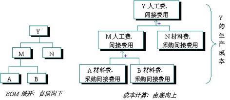 關(guān)于各產(chǎn)品生產(chǎn)成本的計算,我們用一個例子來簡要說明。圖2左部是產(chǎn)品Y的BOM展開:
