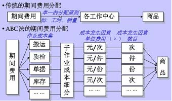 傳統(tǒng)的期間費用分配是單一地以人工時間或機器時間為分配依據(jù),把總的期間費用分配到各工作中心。財務(wù)上則作為一筆帳籠統(tǒng)處理。隨著生產(chǎn)自動化程度的提高以及產(chǎn)品種類越來越復(fù)雜,這種強調(diào)人力勞動因素的粗放型計算方法已經(jīng)不能滿足企業(yè)的需要。新的環(huán)境呼喚管理理論技術(shù)上的新突破──80年代末,由R.Cooper與R.S.Kaplan提出了作業(yè)基準(zhǔn)成本法(ActivityBasedCosting,簡稱ABC法,注意區(qū)別于庫存管理中的ABC分類法)。目前ABC法在國內(nèi)企業(yè)的應(yīng)用尚不普遍,軟件實現(xiàn)上也多見于國外大型ERP軟件。圖3簡要比較了傳統(tǒng)的期間費用分?jǐn)偡椒ㄅcABC法的區(qū)別。