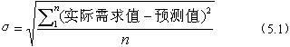 假定實(shí)際需求的發(fā)生服從以預(yù)測值為均值的正態(tài)分布,通過正態(tài)分布的標(biāo)準(zhǔn)差σ可以表示適當(dāng)?shù)陌踩珟齑媪俊N覀兎Q實(shí)際需求值和預(yù)測值的差為偏差。標(biāo)準(zhǔn)差σ可通過如下公式來計(jì)算: