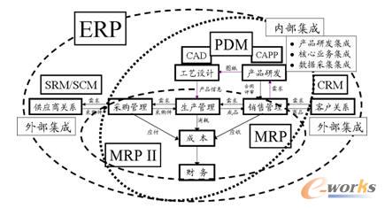 內部集成包括3個方面,就是同產品研發設計的集成,內部核心業務的集成和數據采集的集成;已超出了MRP II的范圍。外部集成就是同客戶和供應商以及各合作伙伴的信息集成。覆蓋的業務流程范圍是相當廣闊的。見下圖。我國真正實現這一要求的企業還是不是很多,信息化管理的道路還相當漫長,也是人們常說的“信息化沒有終點”的道理。