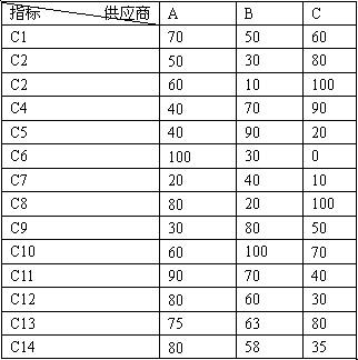 假設(shè)現(xiàn)有A、B、C三個(gè)ERP軟件供應(yīng)商,利用圖1所示的評(píng)價(jià)指標(biāo)體系,各指標(biāo)通過(guò)無(wú)量綱化處理獲得因素集