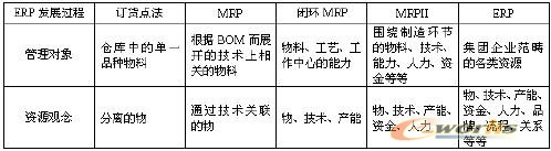 ERP所關注的資源,主要還是那些能夠通過有效管理而增加其時間上、技術上、資金上價值的資源,例如零部件、設備產能、客戶關系等等,而不是傳統意義上的自然資源。這一點我們可以從ERP的發展歷史(如圖2)推斷得出:在訂貨點法階段,管理的對象是倉庫中某一個品種的物料,是將各自分離的原料、零部件、產成品等作為資源進行管理;在物料需求計劃(MRP)階段,管理的對象根據BOM擴展到了技術上相關的所有物料,物的資源內部通過技術產生了關聯;到了閉環MRP階段,資源的范圍除了物之外,還包括技術與產能,管理的內容于是擴充到了物料、工藝以及工作中心的能力;而制造資源計劃(MRPII)已經基本上將圍繞制造環節的資源范疇全部囊括了,物、技術、產能、資金、人力均已經進入到了可以計算可以量化管理的資源列表之中。到了20世紀八、九十年代的時候,跨行業、多地點經營的集團企業已經開始考慮如何將物、技術、產能、資金、人力、品牌、流程、關系等等各類資源優化整合發揮最大效能的問題了,而ERP這一概念以及隨后誕生的各種ERP軟件,就是為解決企業這一難題而提出的解決辦法。