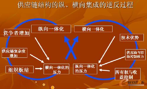 剛才我講集成,供應鏈講集成有兩種,一種縱向一種橫向,所謂縱向集成就是縱向一體化,橫向集成就是橫向一體化,縱向集成什么都自己做,從原料加工到半成品到成品,一直到銷售全部囊括。80年代以前企業是縱向集成,80年代以后是橫向集成,就是聯盟。你不屬于我,我不屬于你,從行政上沒有隸屬關系,但是有利益關系,合作的關系。縱向一體化,橫向一體化是逆反的關系,當一個企業縱向一體化到一定程度以后,自然可能就向橫向一體化發展,或者說當整個市場上很多人在縱向一體化的時候,就會有人走橫向一體化。縱向一體化的時候,就會有其它人跟你競爭,他也在做縱向一體化,大家都做縱向一體化,供應鏈復雜度增加了。全部都要管,供應鏈組織就板結了,就是官僚化,一官僚化以后大家要解體,解體以后又往橫向一體化發展,開始剝離出來,比如說寶供物流從寶潔里面分離出來,原來是寶潔底下一個部門,一分離出來就變成一個合作伙伴,而不是內部一部分。