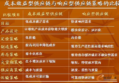 這兩類供應鏈運作模式取決于這個企業的產品特征,或者說市場特點。成本效應性供應鏈更強調追求目標,就是低成本響應顧客需求,而快速響應供應鏈強調就是快速響應市場,所以策略上有不同。比如在產品設計,市場的定價,制造策略,庫存、物流交貨,供應商采購策略,以及物流運輸等等都會有不同,而一個是追求成本,一個是追求時間,這個是兩大不同的策略。