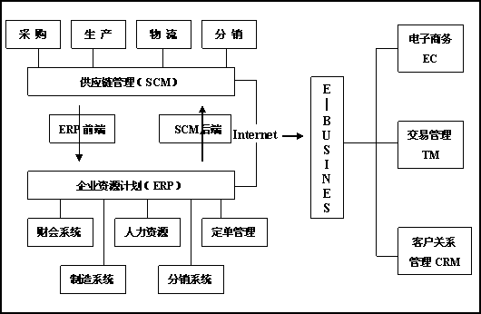 為了使企業的業務處理流程更加連貫,增強企業對市場的響應能力和市場競爭力,必須將ERP與EC有機地結合在一起,組成一個集成的企業信息系統。在這個集成的系統中,企業的各種實時信息可以得到及時的處理。到目前為止,企業中的各種系統如EC、ERP、SCM和CRM等的關系還不是很清楚,如何成功地把這些系統有效的集成在一起并高效率的運行是目前急需解決的突出問題。而想有效地將不同的系統集成在一起,首先要確定集成系統的核心組成部分及其結構。在電子商務環境下,ERP、SCM和CRM是企業信息系統的重要組成部分。其中SCM與ERP的主要區別在于它只對供應鏈上的有關信息進行管理,而很少涉及企業內部的經營活動?蛻絷P系管理(Customer Relationship Management, CRM)是以客戶需求為中心來組織推動整個企業的經營,其主要功能是記錄客戶與企業的交往和交易,并將有可能改變客戶購買行為的信息加以整理和分析,同時進行商業情報分析,了解競爭對手、市場和行業動態[5]。