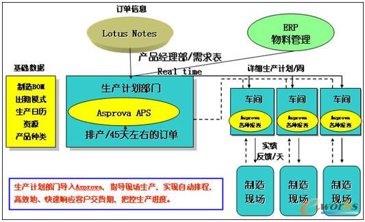 APS系統(tǒng)實施涉及到NOTES系統(tǒng)和ERP系統(tǒng),下圖為APS系統(tǒng)與NOTES和ERP的結(jié)合: