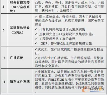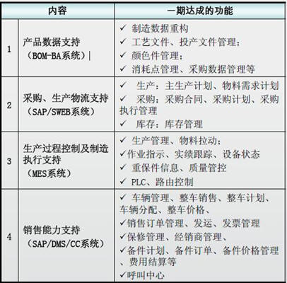 東風乘用車信息系統一期規劃項目:BOM(BA)系統、制造執行系統(MES)、企業資源管理(SAP)系統、供應商交互平臺系統(SWEB)、經銷商管理系統(DMS)、生產試裝管理系統(PTS)、信息共享平臺系統(EIP)、呼叫中心系統(CallCenter)、外部網站系統建設、弱電系統集成實施(包括CCR機房工程、綜合布線系統、安防工程、一卡通系統、3A系統)、計算機網絡設備與集成、精密空調與UPS設備與集成實施、供應商和經銷商網絡支持設備。
