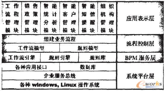 圖1為基于BPM的產(chǎn)品批發(fā)業(yè)務(wù)集成平臺架構(gòu)圖,系統(tǒng)總體架構(gòu)分為四層,各層詳細功能如圖l所示。