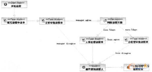 整個平臺使用JSP來實現(xiàn)系統(tǒng)頁面,業(yè)務(wù)流程管理引擎采用JBPM,數(shù)據(jù)庫存儲支持采用Hibernate實現(xiàn)。現(xiàn)以員工請假流程介紹實現(xiàn)過程。