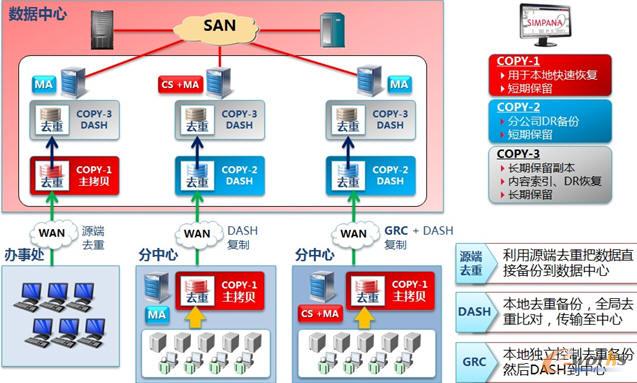 源端去重技術適合數據量相對較小的分支機構CommVault Simpana的“源端去重”技術將分中心的數據先在本地生產服務器做源端去重,去重后的數據本地不落地,直接將備份數據和編錄信息傳到總部數據中心的介質管理服務器。采用此方案,分支機構的數據中心無需本地部署備份服務器和備份設備,總部可以統一管理分支機構備份和恢復策略,并結合源端重復數據刪除,通過WAN實現多中心的數據保護,節省了小規模數據中心的備份設備的投資和管理成本。