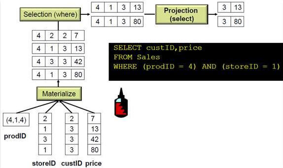 傳統(tǒng)的行式數(shù)據(jù)庫(kù)運(yùn)算, 在運(yùn)算的一開(kāi)始就解壓縮所有數(shù)據(jù),然后執(zhí)行后面的過(guò)濾,投影,連接,聚合操作