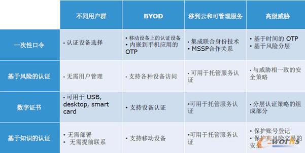 可見,新時期的身份認證,需要針對于不同的用戶的群體采取不同的認證方式。馮顧問列舉這些不同群體就包括內部的員工、臨時工、合同工、合作伙伴、客戶、審計人員,還有遠程需要接入的員工等等,這些用戶需要在任何的時間從任何的地方(比如在家里、出差的時候)使用任意設備(包括傳統的筆記本、臺式機或者是ipad等各種移動設備)通過這些設備來進行安全的訪問。