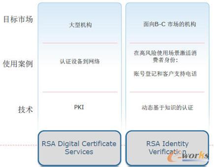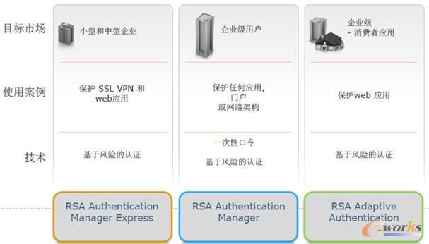 在解決方案方面,RSA針對于不同的目標市場都有相應的不同使用場景,并且采用不同的技術和不同的解決方案,如圖4和圖5所示。對于小型和中型的SMB的企業,主要用在保護SSL VPN和網絡應用,所以使用基于風險的認證,采用的是RSA Authentication Manager Express解決方案;對于企業級用戶,需要保護任何應用門戶以及網絡架構,這里面使用認證的技術有一次性口令以及基于風險的認證,后臺使用的是RSA Authentication Manager認證管理器;對于企業級的消費者,主要是保護團隊的應用,比如保護網銀、網上游戲等等,還是使用基于風險的認證技術,采用RSA自適應身份認證。(自適應是根據客戶的行為、根據客戶不同的用戶群、根據不同的使用產品和風險的級別,采用不同的認證方式。);對于大型機構對設備的認證,采用RSA的數字證書服務;對于面向B2C的市場,是動態的基于知識的認證,比如我在賬號做登記或者做客戶支持電話的時候使用。